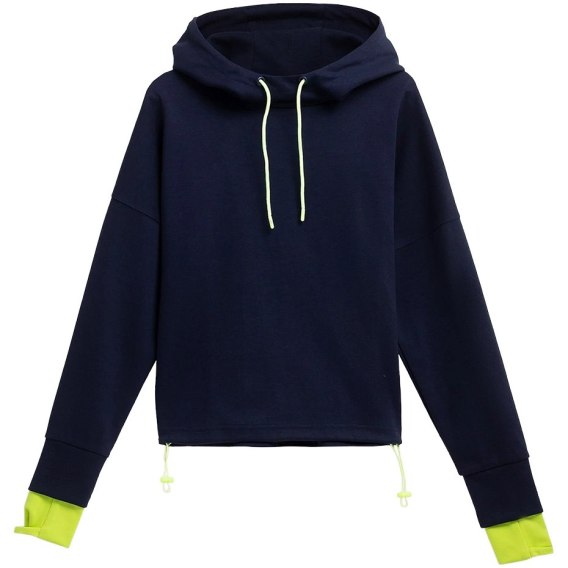 Damska bluza 4F prezentuje sportowy styl, który sprawdzi się w czasie codziennych aktywności. Miękka konstrukcja z poliestrowych włókien. Dwuwarstwowy kaptur z regulacją 2D. Mankiety z otworem na kciuki. Regulacja u dołu na elastyczny ściągacz ze stoperem. Model w kolorze granatowym z neonowymi detalami.