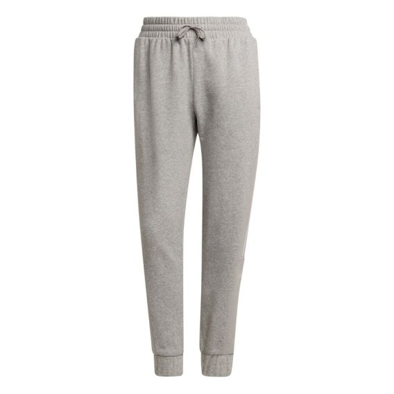 Spodnie dresowe dla kobiet marki adidas. Sprawdzą się podczas codziennego użytkowania. Zwężane nogawki wykończone ściągaczami oraz elastyczną talią ze sznurkiem do regulacji. Otwarte kieszenie boczne. Model w kolorze szarym.