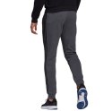 Męskie spodnie dresowe adidas prezentują klasyczny sportowy styl. Ciemnoszary fason dopełniono charakterystycznymi paskami w kolorze czarnym. Dopasowany krój ze ściągaczami u dołu nogawek. Elastyczna talia regulowana sznurkami. Otwarte kieszenie boczne na drobiazgi. Konstrukcja wykonana z miękkiej tkaniny.