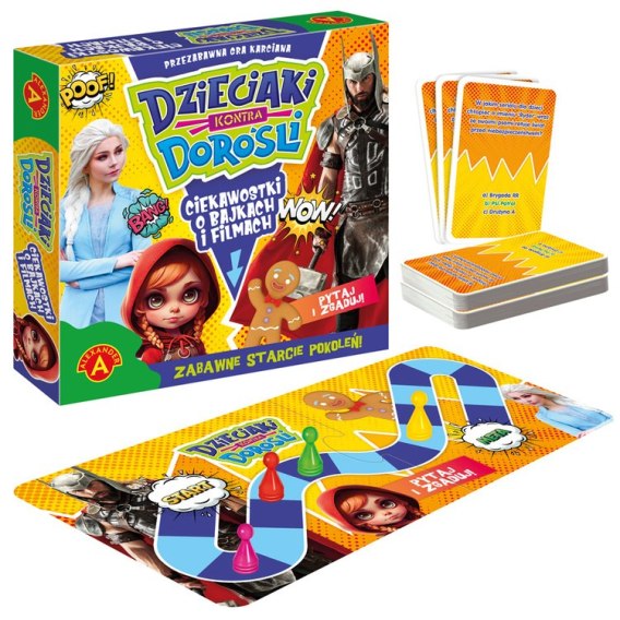 Rodzinna gra karciana o bajkach i filmach, dzieci kontra dorośli to dopiero może być rozgrywka pełna emocji! Co mogło obudzić Śpiącą Królewnę? Jak nazywa się syn Homera Simpsona? Gdzie mieszkają Muminki? Czy jesteście gotowi na wyjątkowe starcie pokoleń w przezabawnej grze karcianej? Tutaj dzieciaki rywalizują z dorosłymi, odpowiadając na podchwytliwe pytania. Zabłyśnij wiedzą o filmach i bajkach i zostań zwycięzcą!
