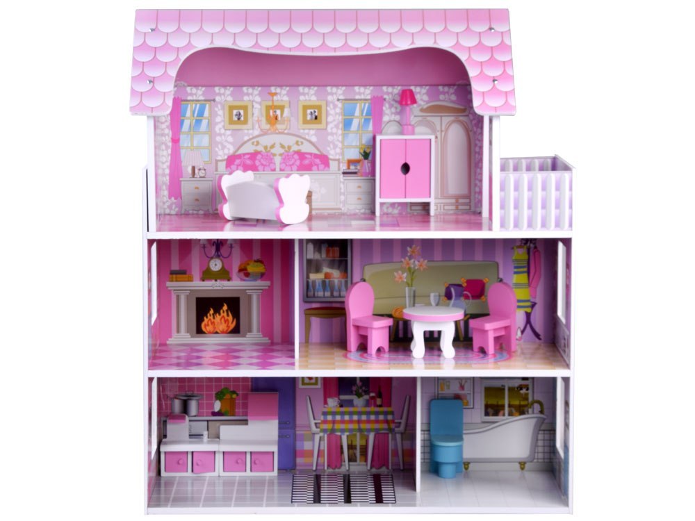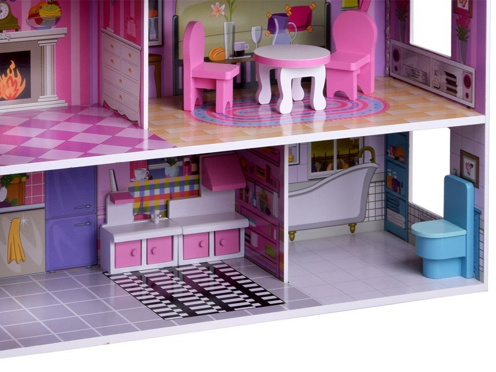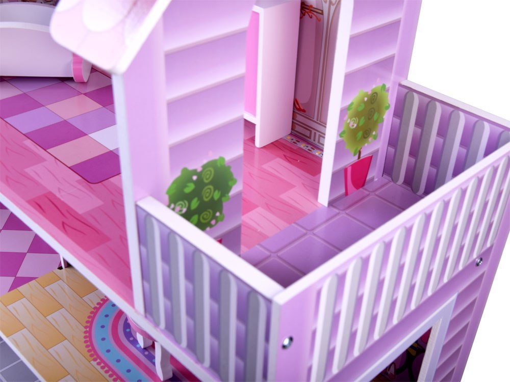 Stylowy, trzyczęściowy domek dla lalek z trzema piętrami i pięcioma pomieszczeniami to idealna propozycja dla każdej dziewczynki marzącej o własnej willi dla swoich lalek. Domek utrzymany jest w estetycznej kolorystyce różu i fioletu, z efektowną grafiką i starannie zaprojektowanymi detalami. To właśnie ten uroczy, różowy styl sprawia, że każda mała księżniczka marzy o takim domku - pełnym magii, koloru i elegancji.