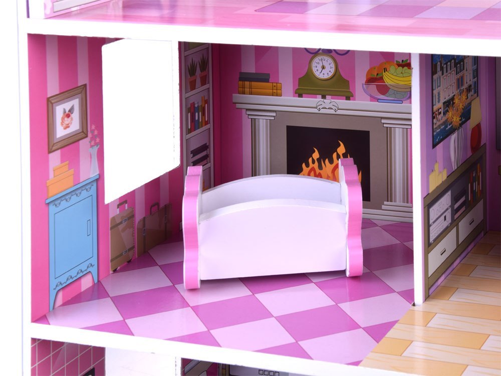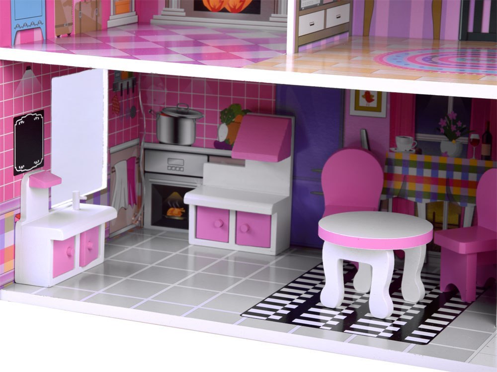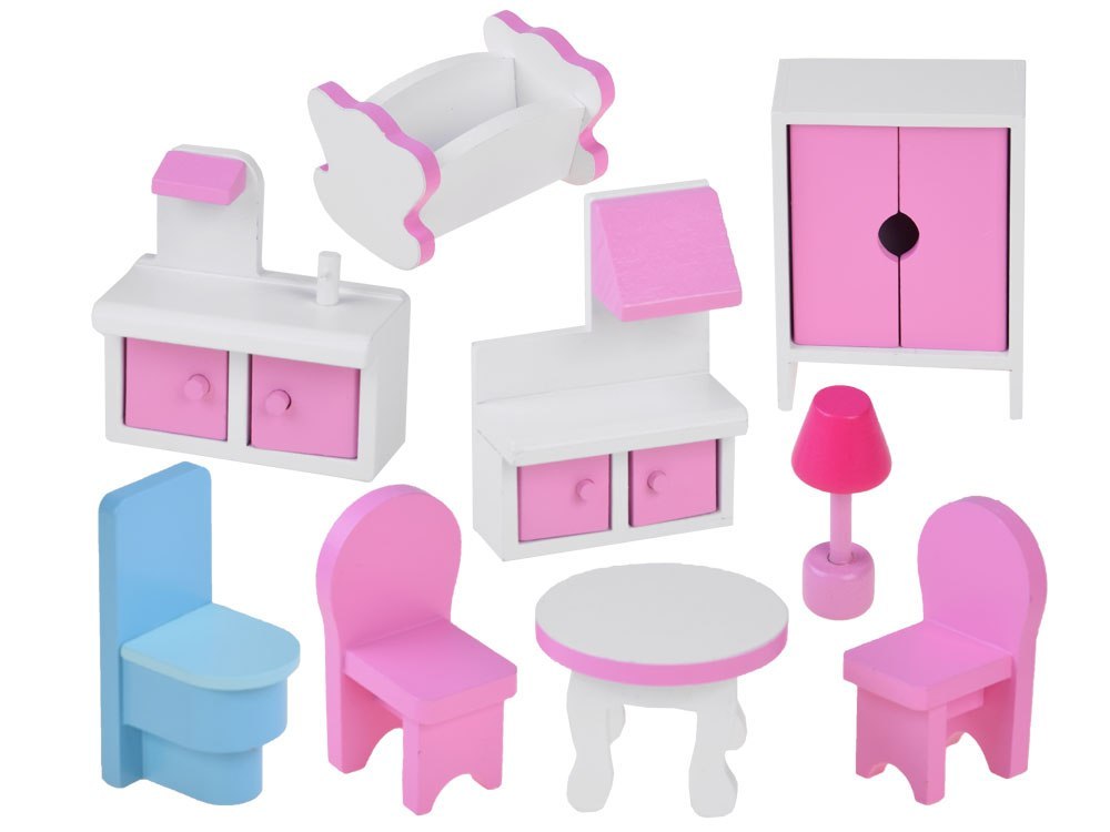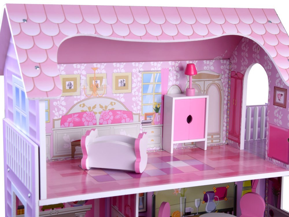 RÓŻOWY Drewniany domek dla lalek + mebelki + oświetlenie LED ZA4130