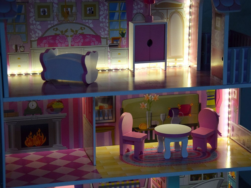 Drewniany domek dla lalek z meblami i oświetleniem LED