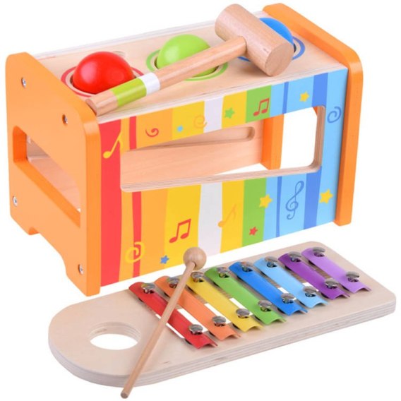 Drewniany, kolorowy zestaw 2w1 Cymbałki + kolorowe piłeczki zapewnią każdemu dziecku mnóstwo kreatywnej, muzycznej przygody podczas zabawy.