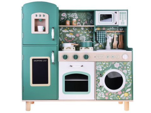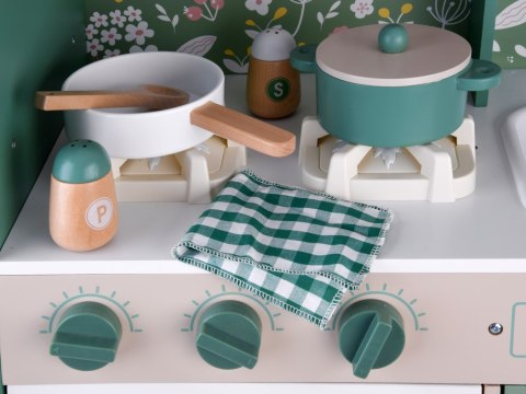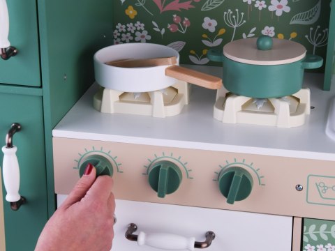 Zielona kuchnia w stylu vintage została wykonana z dbałością o detale. Dzięki kwiatowym dekorom prezentuje się niezwykle efektownie i będzie pasować do każdego dziecięcego pokoiku. Drewniane kuchnie są ponadczasowe i wytrzymałe, a bogato wyposażony zestaw zapewni wiele godzin niesamowitej zabawy.