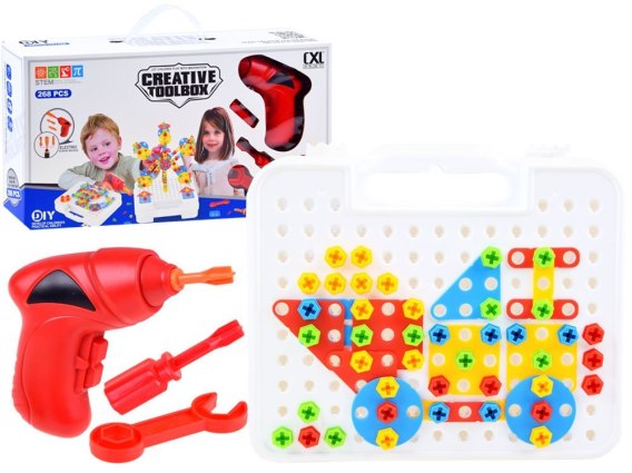 - Narzędzia jak dla prawdziwego majsterkowicza: w zestawie znajduje się wkrętarka zasilana na dwie baterie 1,5 V AA, klucz oraz śrubokręt, które pozwalają dzieciom na prawdziwe „majsterkowanie". Dzieci mogą skręcać i rozkręcać swoje konstrukcje, co rozwija ich umiejętności manualne oraz wzmacnia poczucie samodzielności i odpowiedzialności za stworzone projekty.