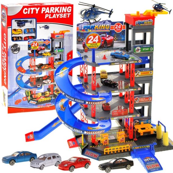 Rewelacyjny wielopoziomowy parking ze stacją benzynową, podnośnikiem, windą, myjnią, warsztatem samochodowym oraz lądowiskiem dla helikoptera. Parking przystosowany jest do "resoraków". Aby wjechać na parking trzeba podnieść rampę. Za pomocą windy autko może przemieszczać się na poszczególne piętra parkingu. Kiedy autko jest brudne koniecznie trzeba pojechać na myjnie samochodową i twoja bryka znów będzie jak nowa. Jeśli brakuje benzyny bez problemu zatankujesz na stacji benzynowej. Gdy chcesz naprawić swój samochód skorzystaj z podnośnika, dzięki któremu naprawisz zawieszenie czy zmienisz oponę. Zestaw zawiera wiele dodatkowych elementów wspaniale urozmaicających zabawę, takich jak znaki drogowe, pachołki.