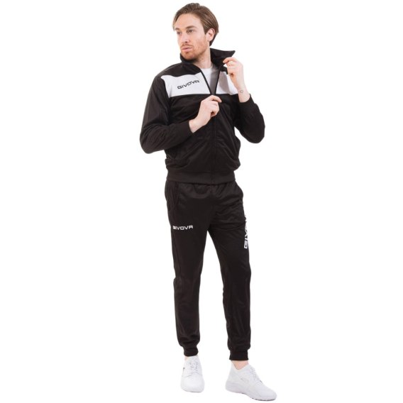 Dres Givova składa się z rozpinanej bluzy i długich spodni. Bluza z wysokim kołnierzem została wyposażona zamek na całej długości. Elastyczne ściągacze w nogawkach i rękawach oraz na dole bluzy. Boczne, otwarte kieszenie w bluzie i spodniach są wygodnym miejscem na ogrzanie dłoni i przechowywanie podręcznych drobiazgów. Regulowana wewnętrznym sznurkiem talia z gumką. Całość została wykonana z poliestrowego materiału, podszytego mikropolarem. Wyszywane logo marki.