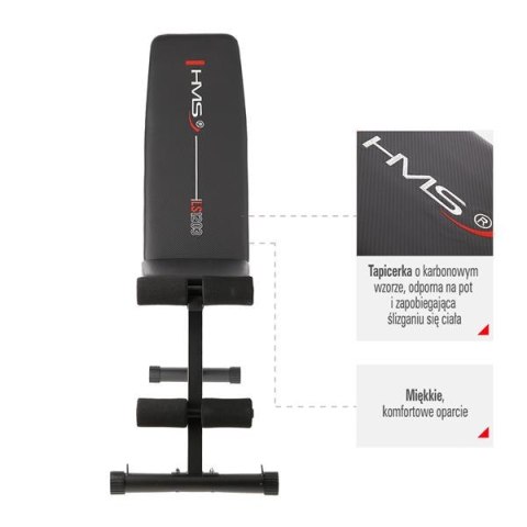 Siedzisko wraz z oparciem zostały wykonane w sposób bardzo dokładny. Twarda deska, pokryta grubą pianką gwarantują stabilizację podczas wykonywania ćwiczeń. Wykończenie to karbonowa tapicerka z wyhaftowanym logo marki HMS, która jest odporna na pot i zapobiega ślizganiu się. W wyposażeniu znajdziemy również gąbki ochronne, które chronią przed otarciem nóg podczas treningu.