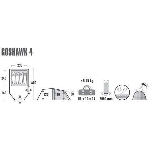 4-osobowy namiot Goshawk 4 w kolorze oliwkowym to doskonały wybór na biwak z rodziną czy przyjaciółmi. Namiot składa się z przedsionka i sypialni. Przedsionek może być wykorzystany jako pomieszczenie gospodarcze. Solidna konstrukcja z wodoodpornego poliestru opiera się na lekkim szkielecie z włókna szklanego i stalowych słupkach. Laminowane szwy i wysokie parametry wodoodporności tworzą wytrzymałą ochronę przed deszczem, a wzmocniona podłoga izoluje namiot od podłoża. Moskitiera skutecznie chroni przed owadami i wspieraja cyrkulację powietrza.