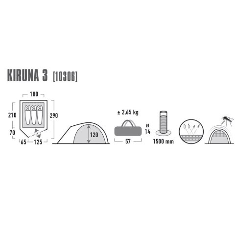 Namiot firmy High Peak przeznaczony jest dla trzech osób, dwupowłokowy, typu igloo, z niewielkim przedsionkiem. Wyposażony w moskitierę. Posiada niewielkie wymiary oraz wagę. Szwy laminowane i wodoodporność 1500 mm.