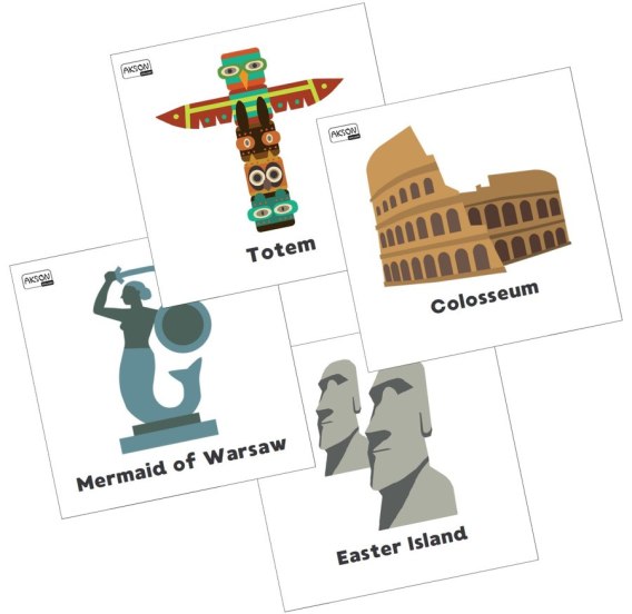 Zestaw zawiera 52 karty. Na kartach znajdziesz kolorowe rysunki zabytków z całego świata, wraz z ich nazwami po angielsku.