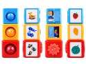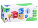 - klocek żółty posiada: okienko, gdzie dziecko będzie mogło przesuwać zasłonę, z obrazkami pory snu, dwa wesołe niebieskie kotki, żółta cytrynka, otwory na wrzucanie kul