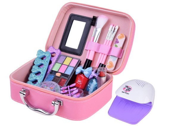 Uroczy kuferek pełen kosmetyków do stworzenia pięknych paznokci i makijażu przypadnie do gustu każdej małej stylistce. Zestaw zawiera mnóstwo akcesoriów do wykonania profesjonalnego manicure, pedicure ze zdobieniami oraz makijażu. Całość zestawu jest zamknięta w prześliczny kuferek wyposażony w lusterko i uchwyty na kosmetyki. Dzięki poręcznej rączce przy kuferku, można go zabrać wszędzie ze sobą, tak jak to robią profesjonalne stylistki.