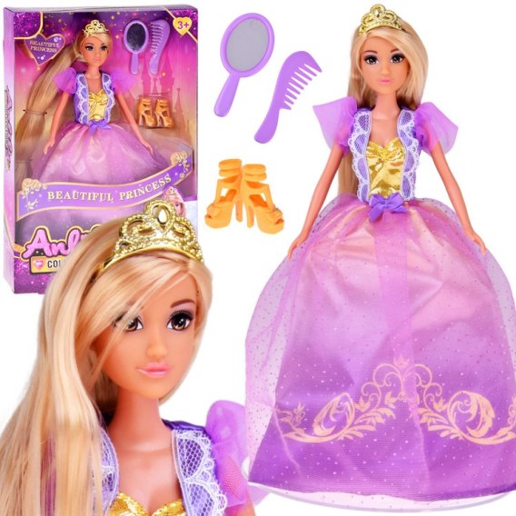 Księżniczka z kolekcji Anlily ubrana jest w balową suknię w kolorach fioletu i złota, ozdobioną błyszczącymi elementami, które sprawiają, że wygląda jak prawdziwa gwiazda królewskiego balu. Na jej głowie znajduje się złota tiara-korona, a w zestawie znajdziesz lusterko i grzebień - idealne do czesania i stylizowania jej długich włosów.