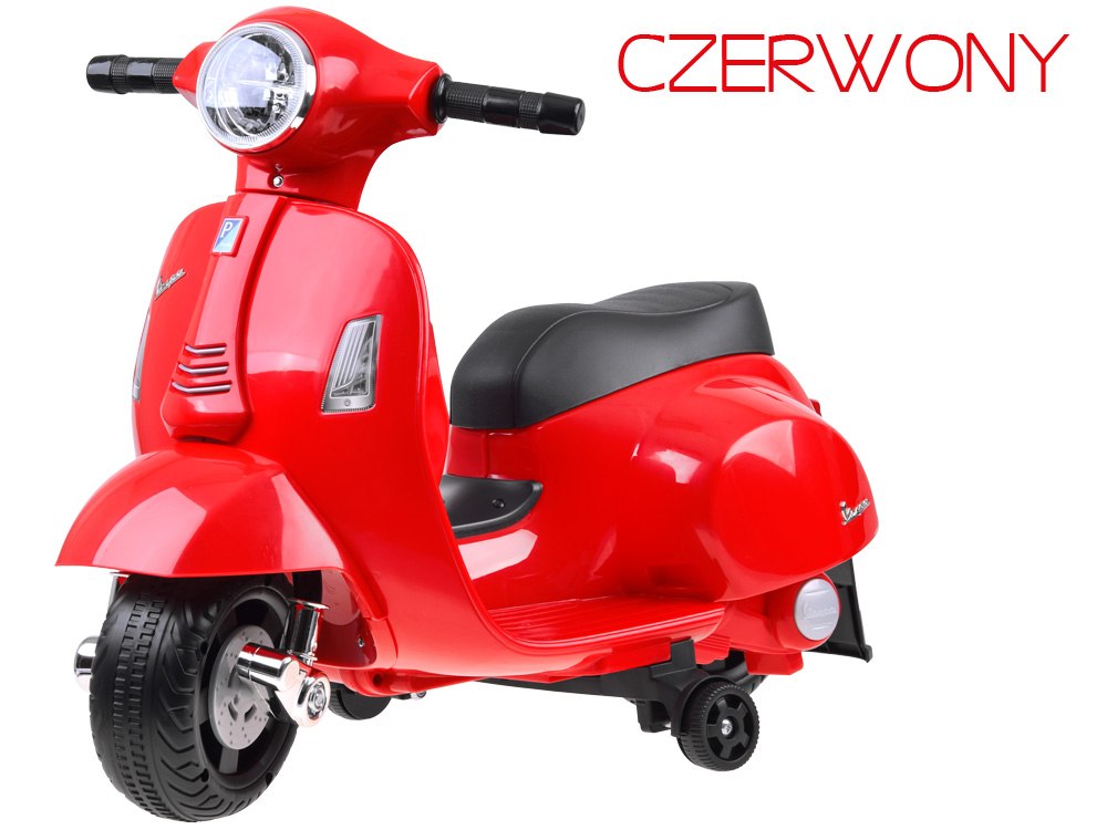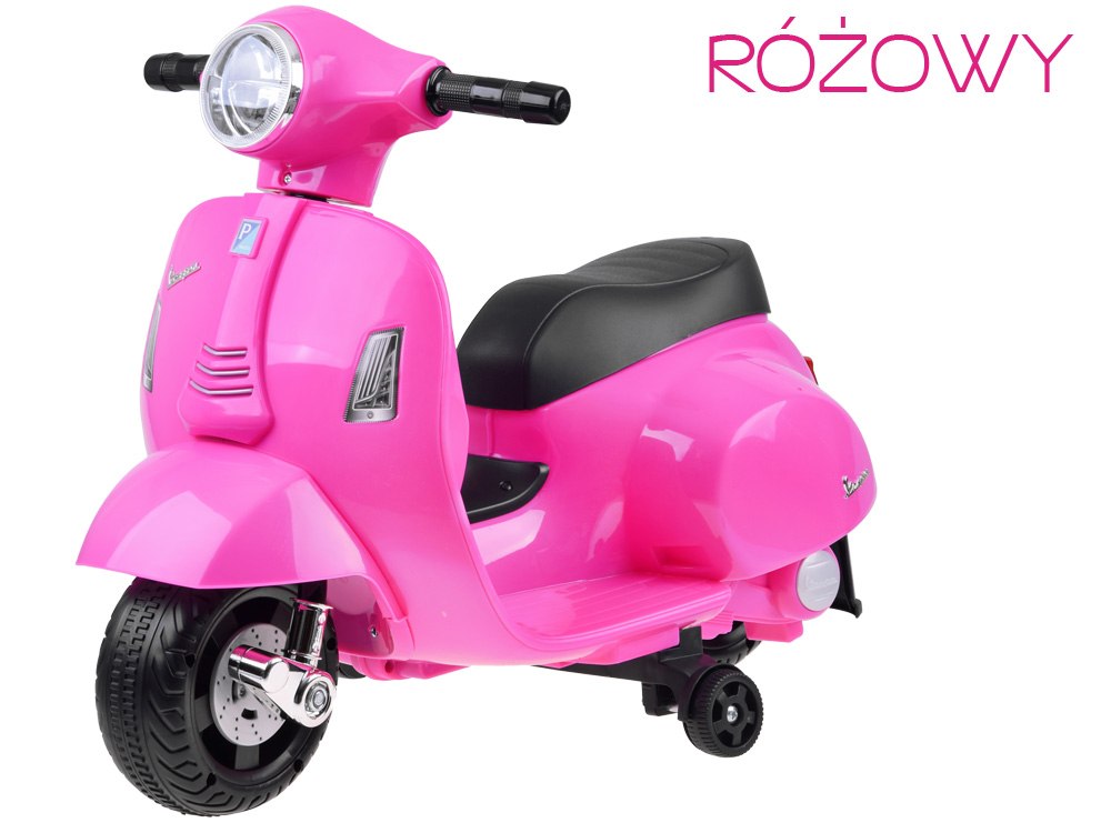 Piękny, klasyczny skuter VESPA sprosta wymaganiom każdego młodego fana dwóch kółek. Motor przeznaczony jest dla najmłodszych pociech, idealny jako prezent urodzinowy lub na inną okazję. Dzięki fantastycznej stylistyce oraz niewielkiemu gabarytowi sprawdzi się w domu, ale także bez problemu pokona alejki w parku czy na placu zabaw. O stabilność skuterka podczas jazdy zadbają boczne kółka co na pewno sprawi, że jazda będzie bezpieczna i przyjemna. Zaletą motorka jest także łatwe wsiadanie i zsiadanie z siedzonka, przez co dziecko może swobodnie dawkować sobie jazdę. Atutem pojazdu są także świecące światła podczas jazdy. W trakcie jazdy motor świeci światłami, kierownica posiada przyciski, pod którymi kryje się dźwięk klaksonu. Jak to przystało w motorze na desce rozdzielczej znajdują się zegary, prędkościomierz (naklejki). Piękny klasyczny skuter dla dziewczynki lub chłopca.