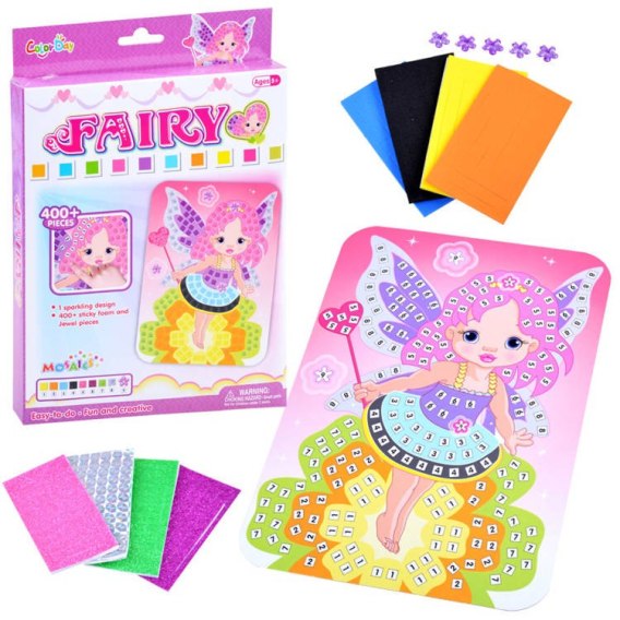 Mozaika wróżka to kreatywny zestaw dla dzieci lubiących prace plastyczne. Zestaw składający się kolorowego obrazka, na który należy wykleić piankowymi kwadracikami, oczywiście dostosowując kolory i kształty.
