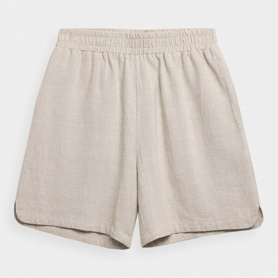 Luźne spodenki z wysokim stanem. Elastyczny pas i dwie kieszenie. Przyjemny materiał z dodatkiem lnu i szeroki krój nogawek zapewnią ci wygodę.