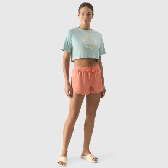 Kolekcja z linii SURF WHOLE DAY została zainspirowana surferskim lifestyle'm i vintage'owym vibem. Charakteryzuje się świeżością i lekkością w stylu retro. Paletę kolorystyczną tworzą kolory zachodzącego słońca, które są dopełnione kolorami morza. Formy w tej linii są minimalistyczne, fasony są wygodne i swobodne. Spodenki plażowe damskie wykonane z lekkiego szybkoschnącego materiału zapewnią komfort i swobodę ruchów w trakcie codziennych letnich aktywności, odpoczynku na plaży czy rekreacyjnego pływania. Posiadają krój regular, który wygodnie dopasowuje się do sylwetki oraz krótkie nogawki do połowy uda. Damskie spodenki do wody są wykonane z materiału syntetycznego, który zapewnia trwałość i jest łatwy w pielęgnacji. Dodatek elastanu (8%) sprawia, że są rozciągliwe i wygodnie układają się na sylwetce. Szorty na plażę damskie wykonane z materiału o niskiej gramaturze 160 gsm, która sprawia, że są one bardzo lekkie. Spodenki nie posiadają podszycia. Posiadają z szybkoschnące włókna, które wspierają odprowadzanie wilgoci z dala od ciała. Wykonane w technologii 4Way Stretch, która sprawia, że materiał rozciąga się we wszystkich kierunkach (w pionie i poziomie). Bez kieszeni. Elastyczny pas z wiązaniem na troki zapewnia wygodne dopasowanie. Boczne rozcięcia dla większej swobody ruchu.