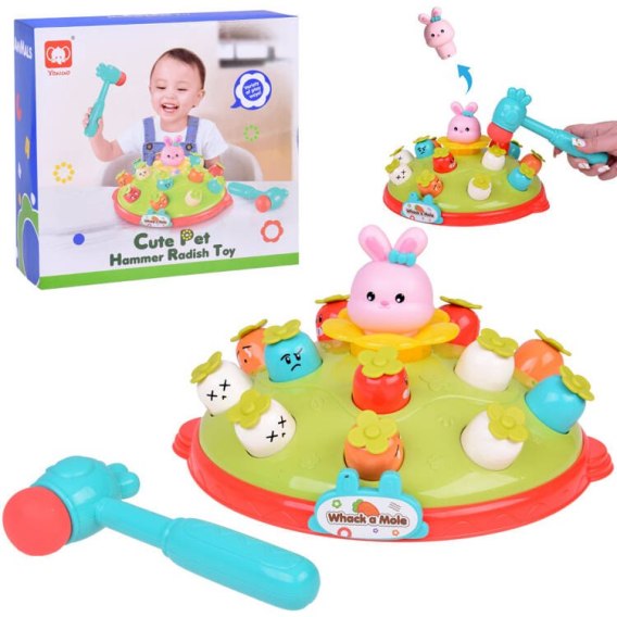 "Uderz młoteczkiem" - czyli okrągłe pole marchewek z różowym króliczkiem na samej górze jest świetną zabawką, dzięki której Wasza pociecha będzie mogła się odstresować, kiedy jest przebodźcowana po całym dniu.
