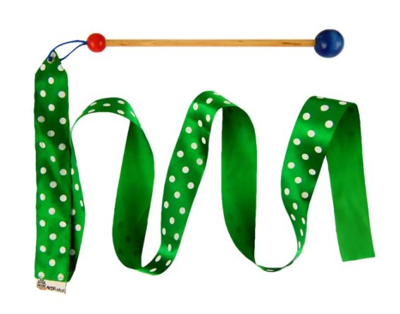 Materiał połączony jest z drewnianą tyczką kolorowym sznureczkiem, a tyczka zakończona jest po obu stronach drewnianymi kulkami, dzięki czemu wstążka idealnie pasuje do małych rączek i jest wygodna w użytkowaniu.