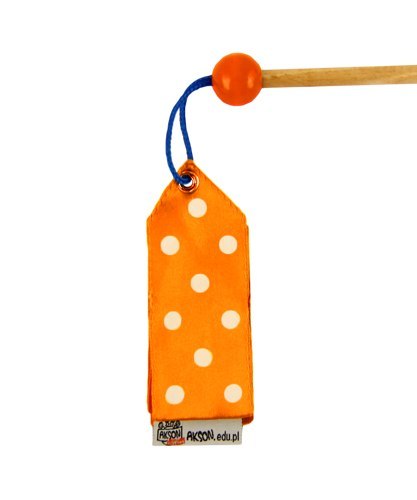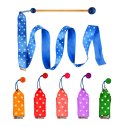 Materiał połączony jest z drewnianą tyczką kolorowym sznureczkiem, a tyczka zakończona jest po obu stronach drewnianymi kulkami, dzięki czemu wstążka idealnie pasuje do małych rączek i jest wygodna w użytkowaniu.