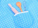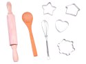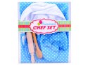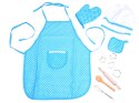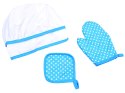 Zestaw składa się z fartuszka, czapki kucharskiej, rękawicy oraz akcesori kuchennych (wałek, łyżka, foremki na ciastka, trzepaczki).